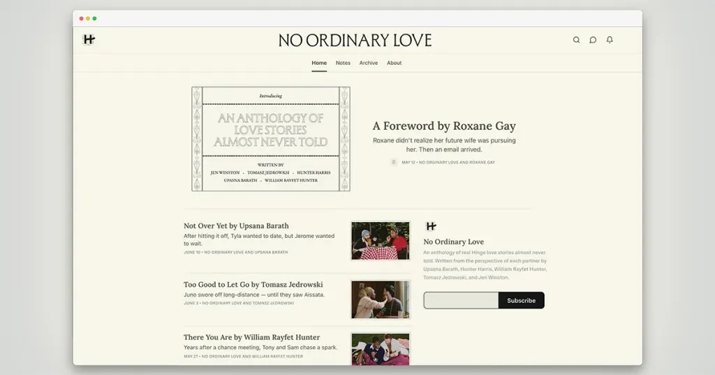 Last year we saw a host of brands and celebrities start up a Substack, the self-publishing newsletter platform that’s experienced a dramatic increase in popularity due to the openness and intimacy it facilitates. Hinge was one of the first brands to do so as part of their ‘No Ordinary Love’ series, created in partnership with Dazed Studio. “Substack has become a place for meaningful discussions about dating and relationships,” said Jackie Jantos, president and CMO at Hinge, “so bringing No Ordinary Love to the platform felt like a natural fit.”