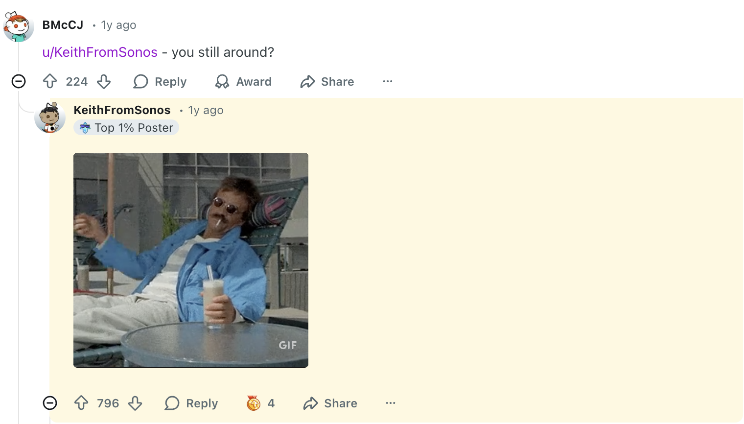 u/KeithFromSonos is a Sonos employee who’s been a beloved part of the r/Sonos subreddit for over two years, responding to fiddly customer queries, alongside sharing his film recommendations (he’s a “sucker for A24 flicks”). His top (or most upvoted post) comes after it was announced that Sonos had laid off 100 employees.