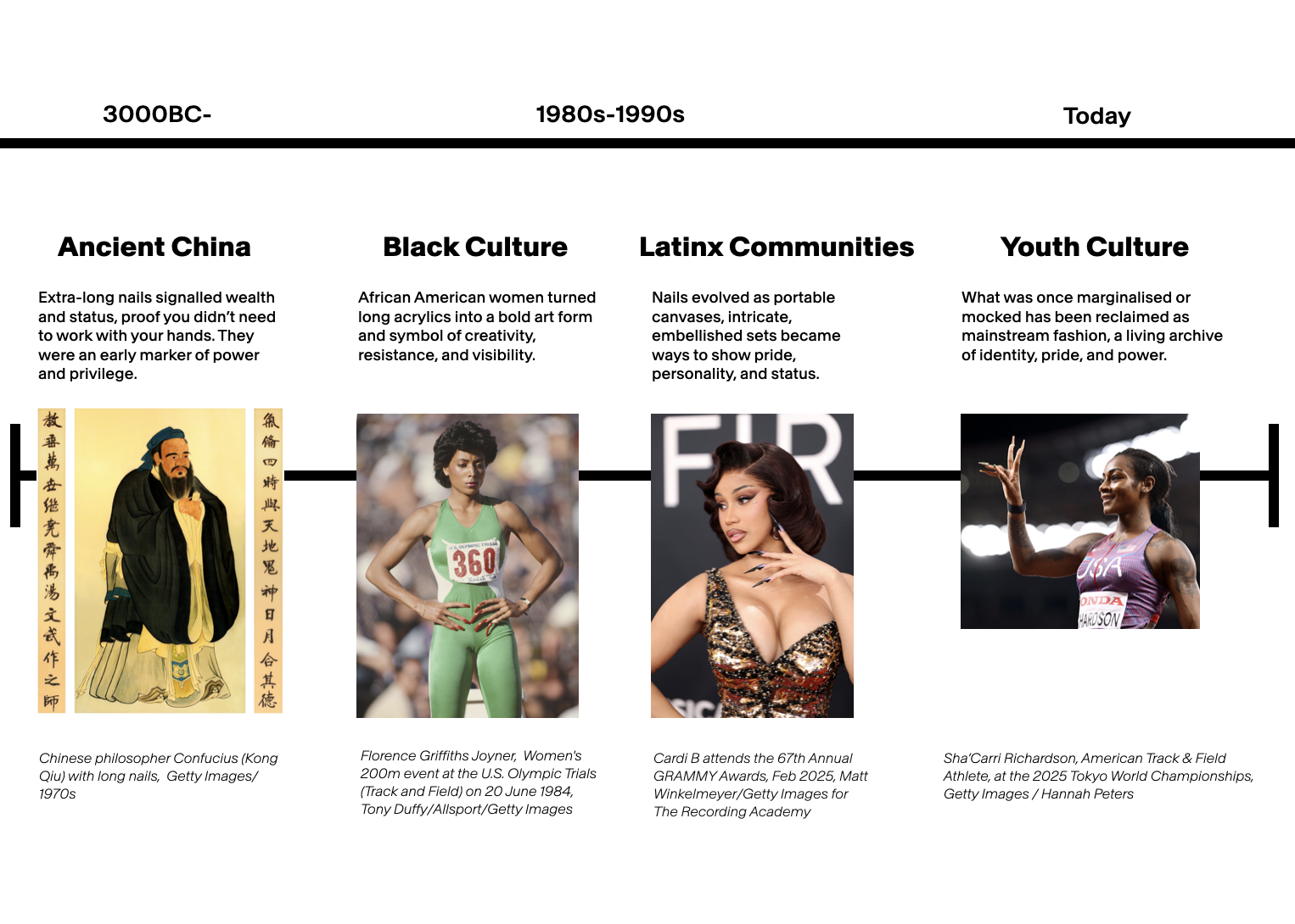 Nails are no longer just beauty maintenance, they’re part of a wider body adornment ecosystem (alongside tattoos, piercings, hair). They act as armour, ritual, and self-affirmation.